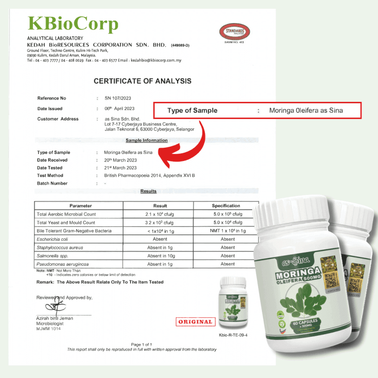 Setiap kapsul Moringa Oleifera as-Sina mengandungi 500mg daun moringa organik. Kami hanya membotolkan kapsul yang telah melalui proses penapisan dan gred herba yang paling terbaik untuk tujuan perubatan. Berhati-hati dengan produk tiruan di luar sana yang berkemungkinan mempunyai campuran dan gred yang rendah.